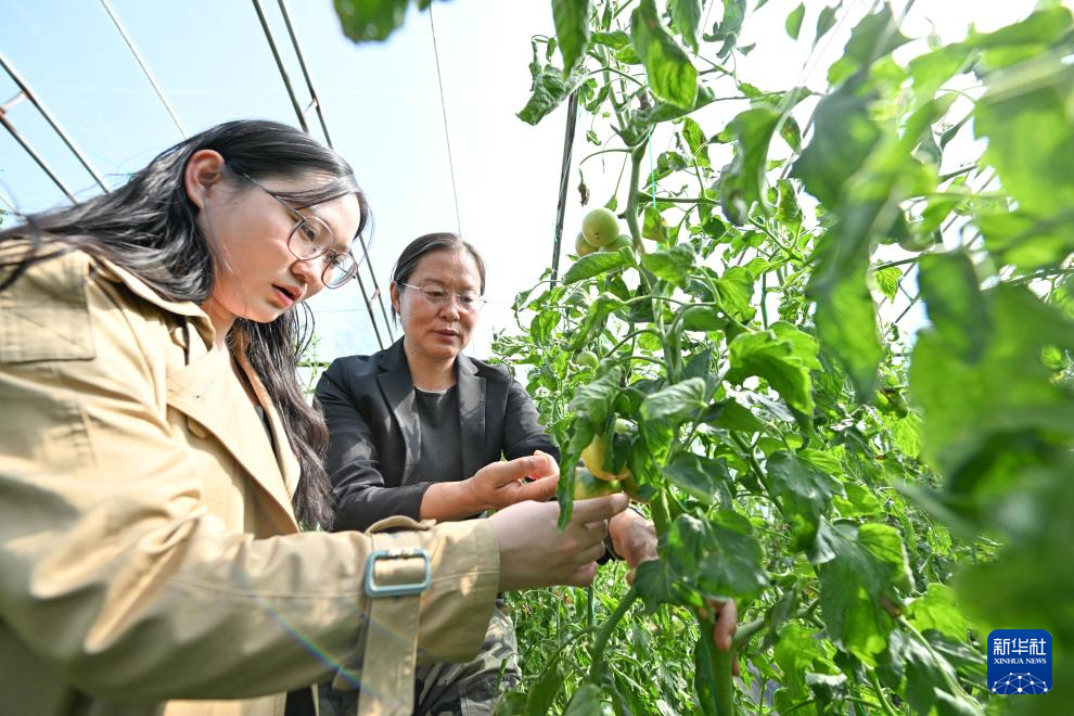 在天津天民田园农业科技示范园,王丽娟(右)为恽子怡布置实验课题(4月24日摄)。新华社记者 孙凡越 摄pagebreak