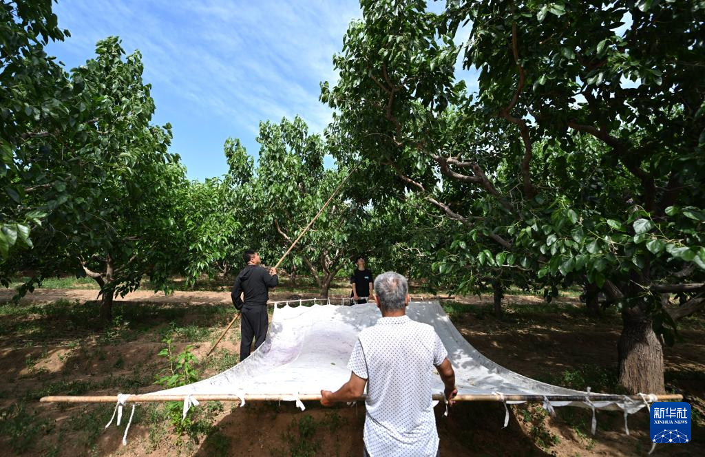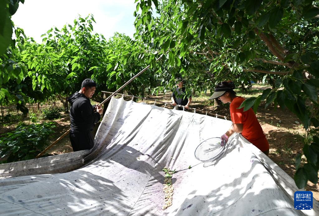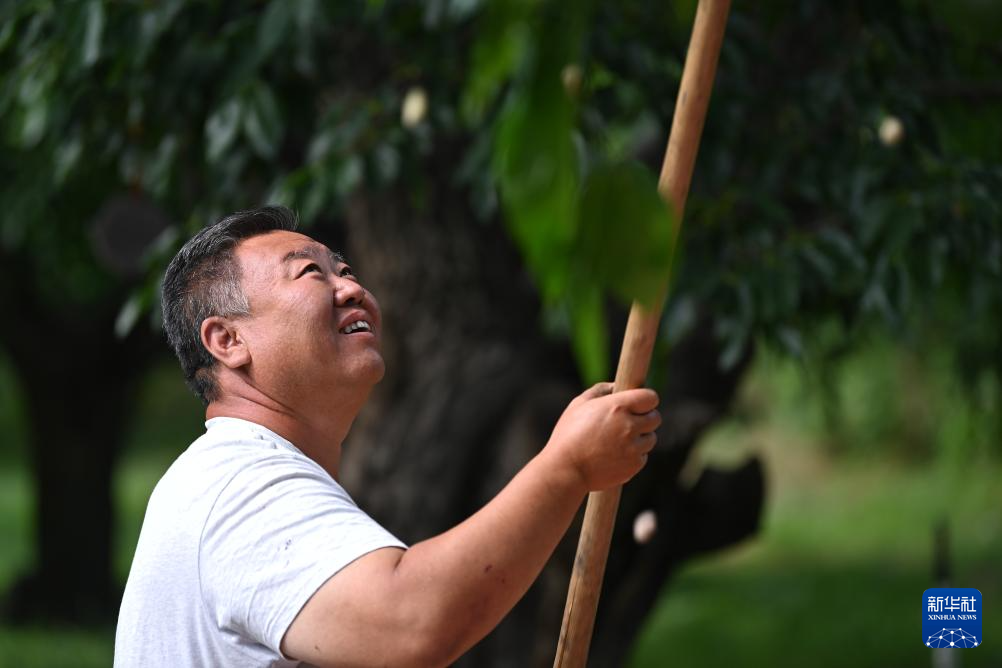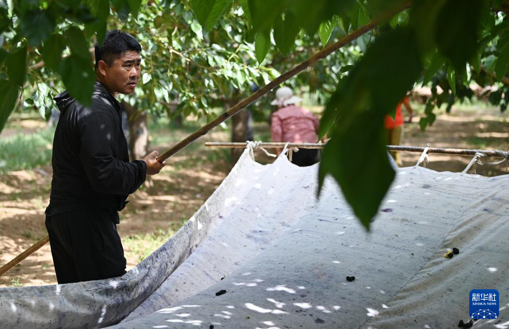 天津市蓟州区别山镇的农户手拿打棍收获桑葚(6月6日摄)。新华社记者 李然 摄pagebreak