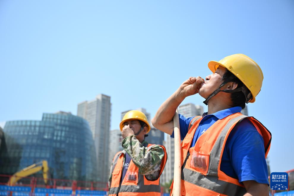 6月11日,在中建三局天津南门外大街商圈北部片区城市更新项目建设现场,户外劳动者喝藿香正气水预防中暑。新华社记者 孙凡越 摄pagebreak