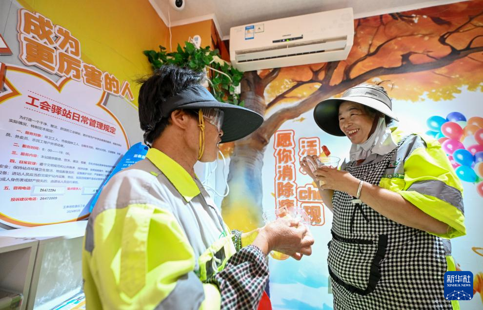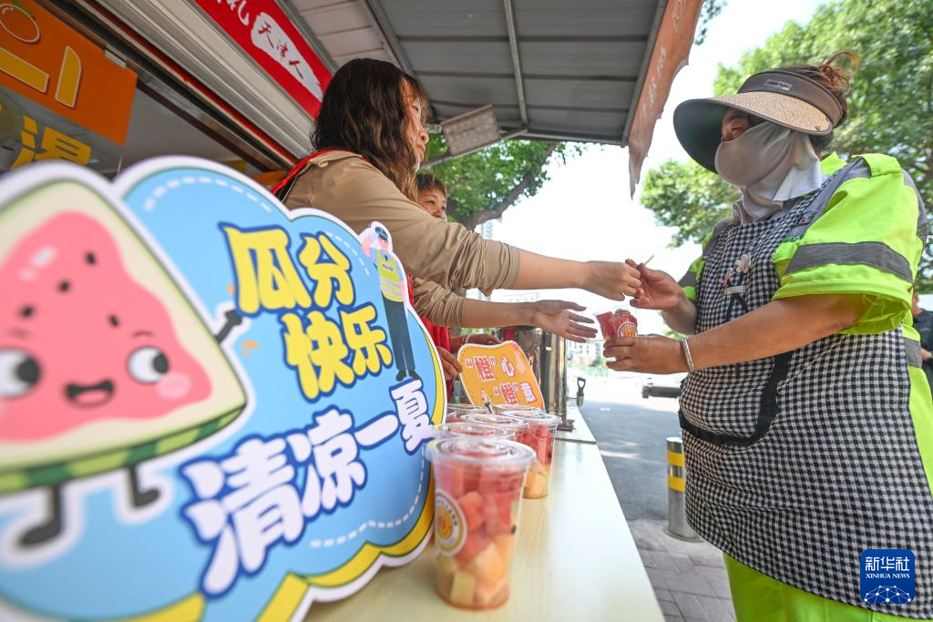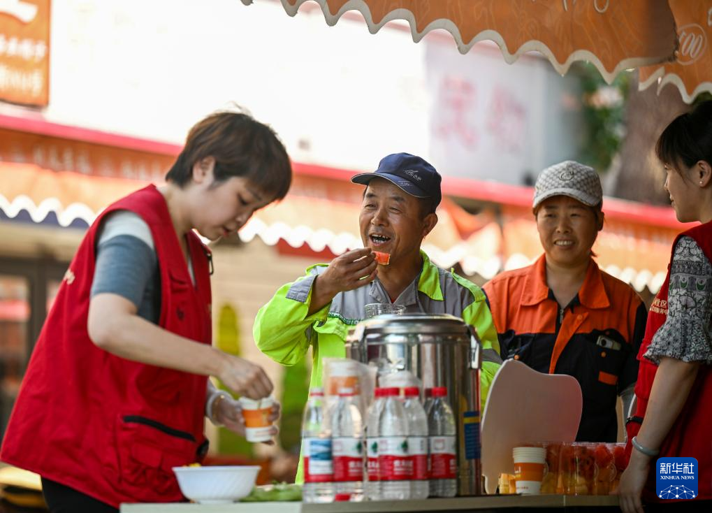 6月11日,在天津市河北区王串场街道的一处工会驿站,街道工作人员为环卫工人提供水果。新华社记者 赵子硕 摄