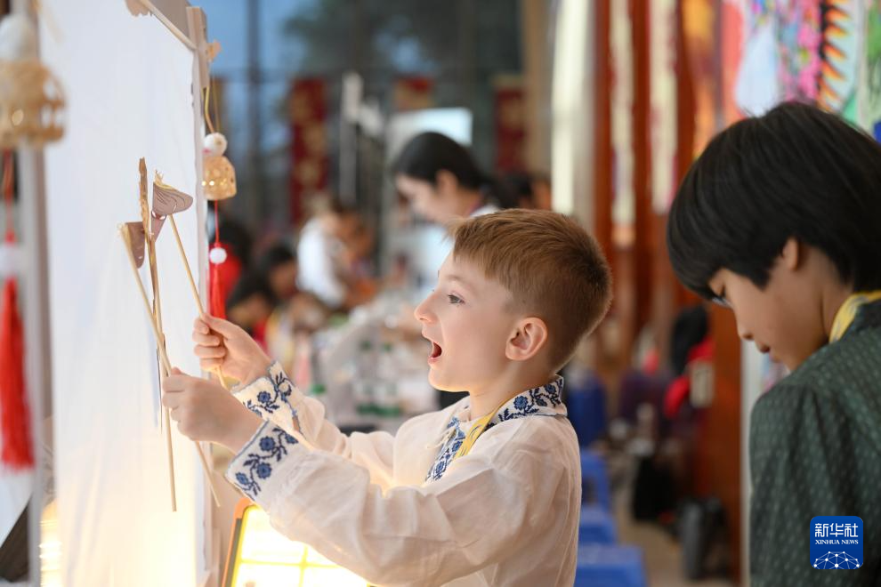 9月26日,小朋友在赛场外体验皮影戏。新华社记者 赵子硕 摄pagebreak