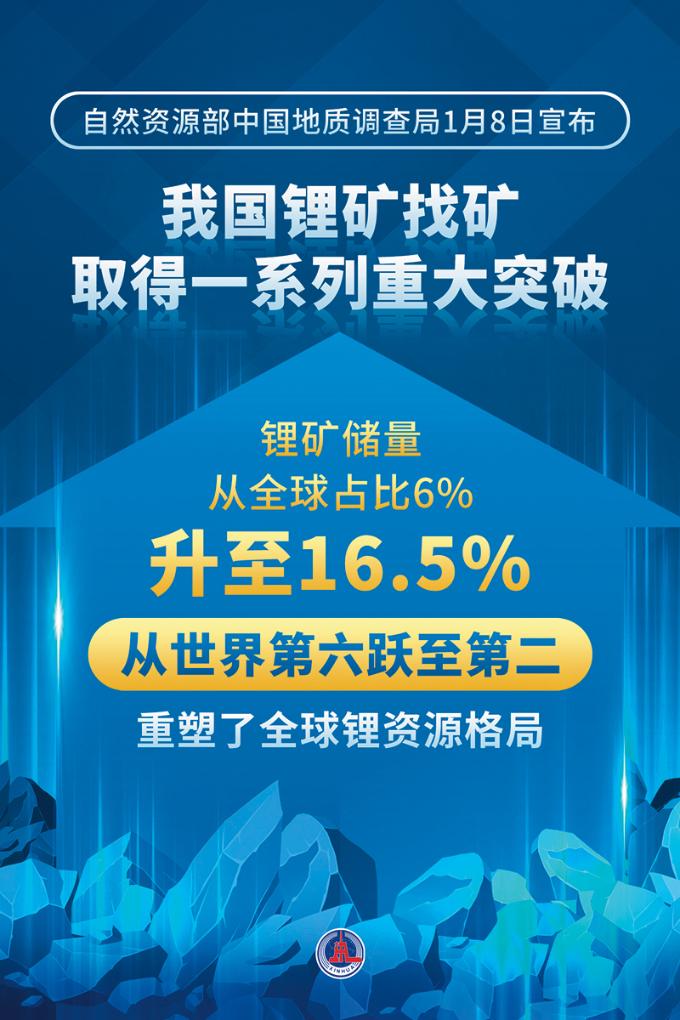 今年初,自然资源部中国地质调查局宣布,在西昆仑—松潘—甘孜发现长达2800千米的世界级锂辉石型锂成矿带,累计探明650余万吨,资源潜力超3000万吨。这一发现使我国锂矿储量全球占比从6%提升至16.5%,从世界第六跃至第二。
