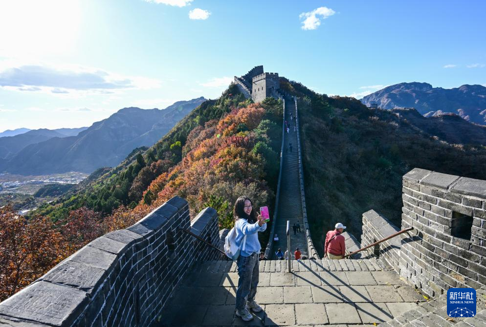 11月1日,游客在位于天津市蓟州区的黄崖关长城上自拍。新华社记者 陈晔华 摄pagebreak
