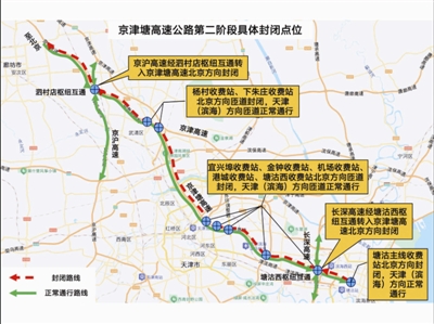 第二阶段:待交通流量平稳后(具体封闭时间将视流量情况提前宣传告知),再封闭京津塘高速公路北京方向(上行)泗村店枢纽互通至津冀省界段道路进行施工,届时京津塘高速公路北京方向(上行)全线封闭,京沪高速经泗村店枢纽互通转入京津塘高速北京方向封闭。