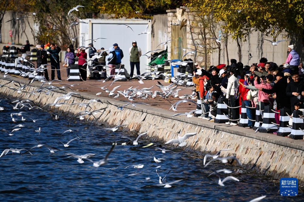 11月13日,游客在海河岸边观赏海鸥。新华社记者 赵子硕 摄
