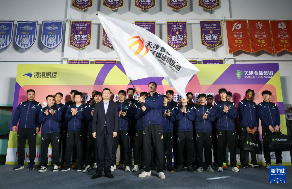12月2日,天津食品集团男排队长毛天一在出征仪式上挥舞队旗。新华社记者 孙凡越 摄