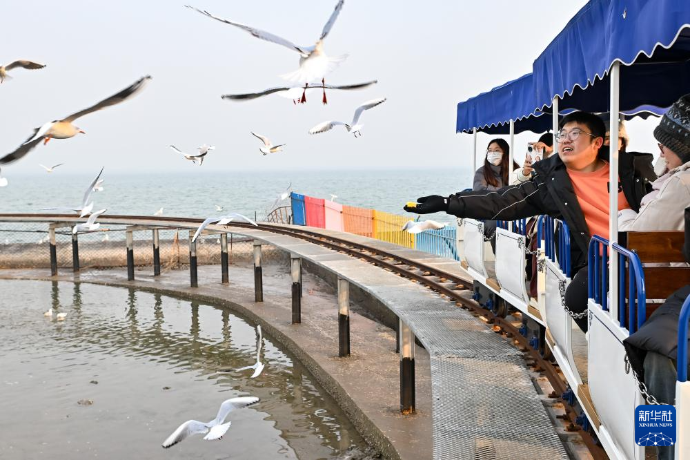 游人乘坐小火车喂食海鸥(12月10日摄)。新华社记者 李然 摄pagebreak