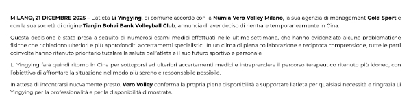 对于李盈莹回国一事,米兰排球俱乐部也发布了声明,称“这一决定是在过去几周多次医学检查后做出的”“检查发现了一些需要进一步专业评估的身体问题”。米兰排球俱乐部感谢李盈莹的专业精神与合作态度,期待不久后再次相聚。