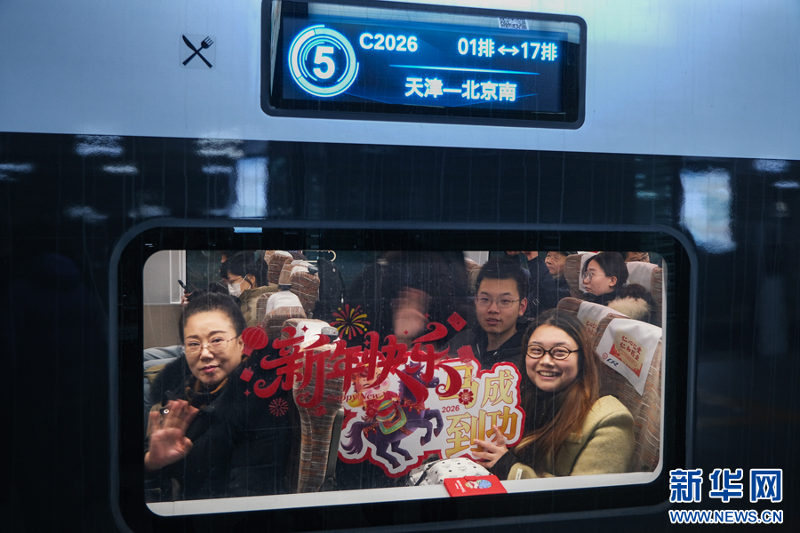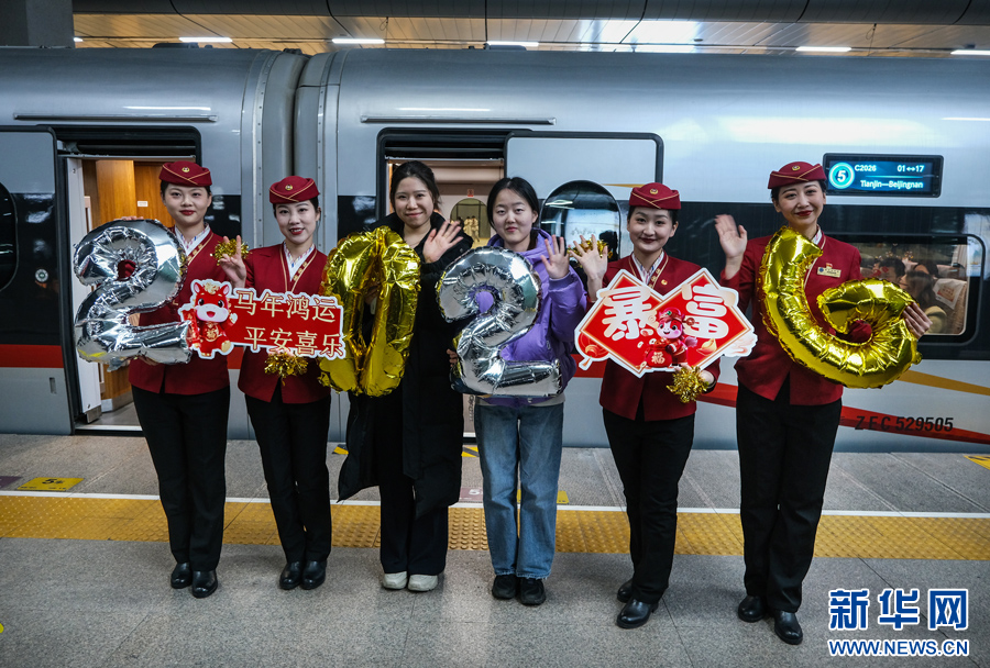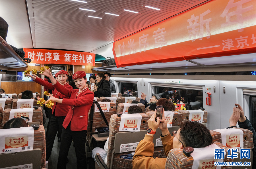 12月30日,2026新年即将到来之际,铁路天津客运段在由天津开往北京南C2026次列车上开展了“时光序章 新年礼赞”跨年辞旧迎新主题活动。为让往返京津两地的旅客在旅途中感受浓厚的新年氛围,乘务人员表演了舞蹈等文艺节目、与旅客互动问答、邀请旅客写下新年心愿,并送上精心准备的新年礼物与节日祝福,陪伴旅客迎接即将到来的2026年。(刘超)pagebreak
