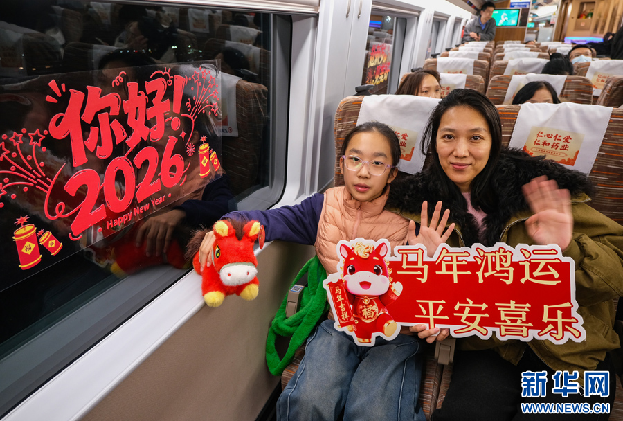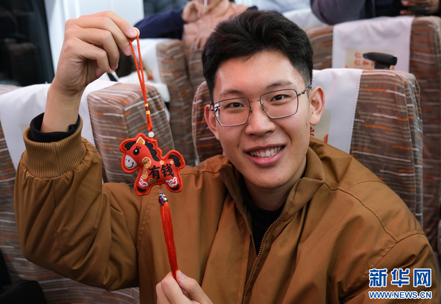 12月30日,乘坐C2026次列车的旅客正在展示新年纪念礼品。新华网发(杨宝森 摄)pagebreak