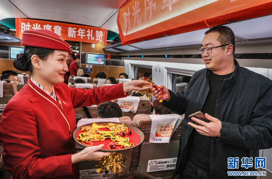 12月30日,C2026次列车乘务人员为旅客送上迎新年纪念礼品。新华网发(杨宝森 摄)pagebreak