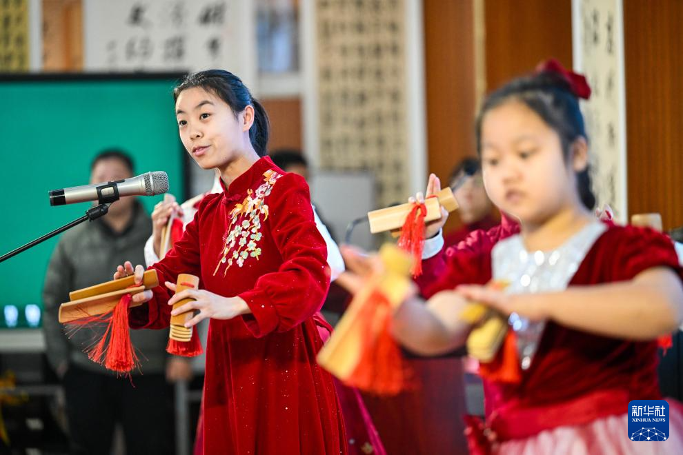 1月6日,天津市武清区杨村第十四小学学生在社团活动中表演快板。新华社记者 赵子硕 摄pagebreak
