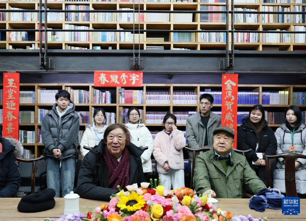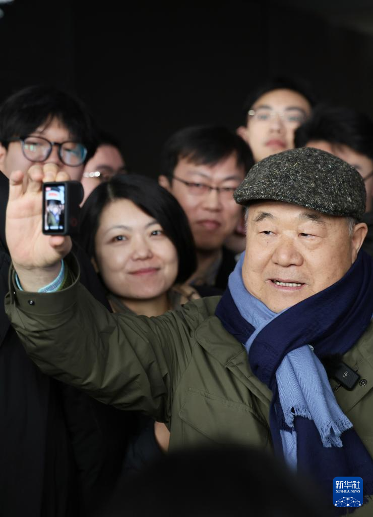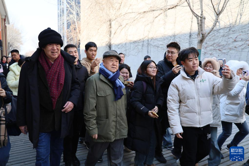 1月8日,在天津大学冯骥才博物馆,莫言和冯骥才在师生代表的簇拥下前行。新华社记者 李然 摄
