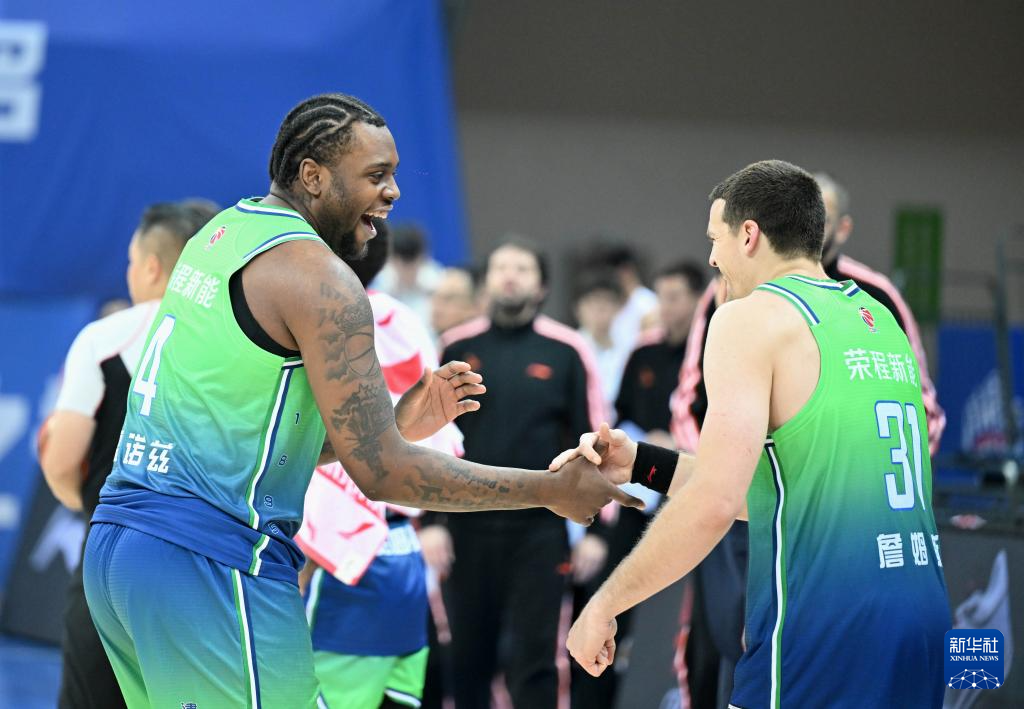 1月14日,天津先行者队球员雷诺兹(左)和队友詹姆斯在比赛后庆祝。新华社记者 赵子硕 摄pagebreak