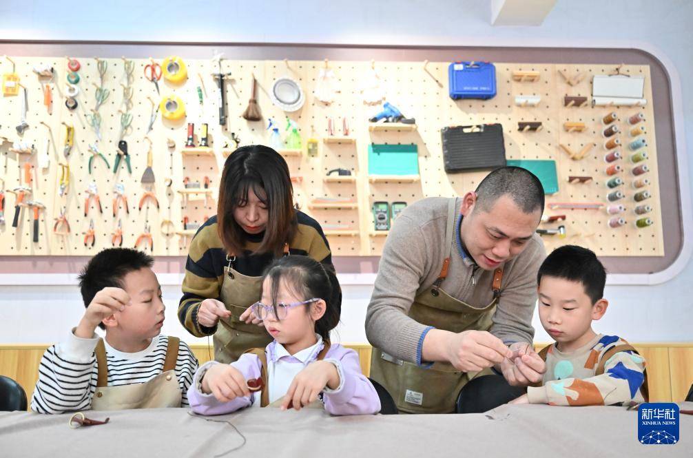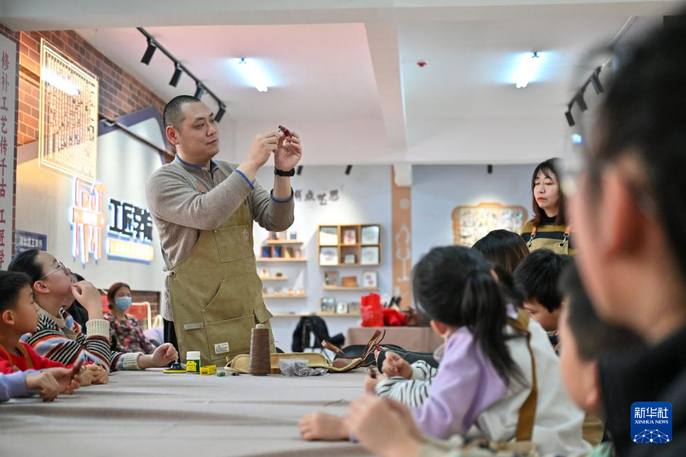 1月30日,在天津市河北区王串场街道环盛里社区,工匠指导小朋友们缝补皮具。新华社记者 孙凡越 摄