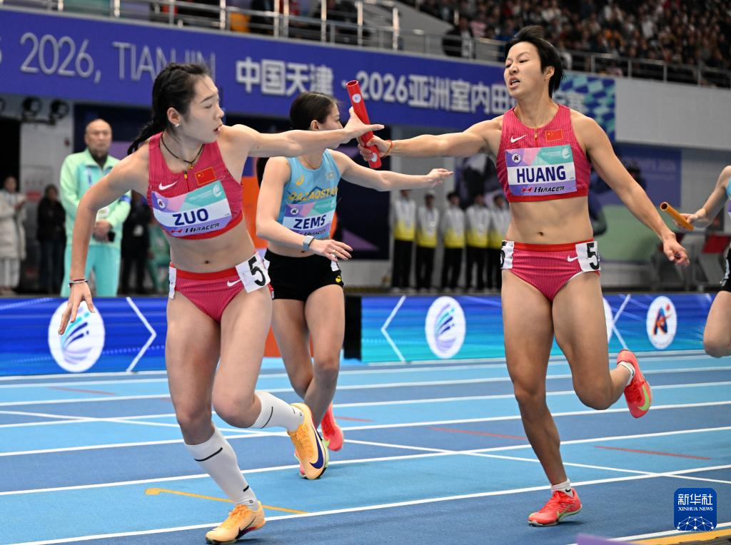 2月8日,中国队选手黄诗瑶(右)、左思雨在女子4×400米接力决赛中交接棒,最终中国队获得亚军。新华社记者 赵子硕 摄pagebreak