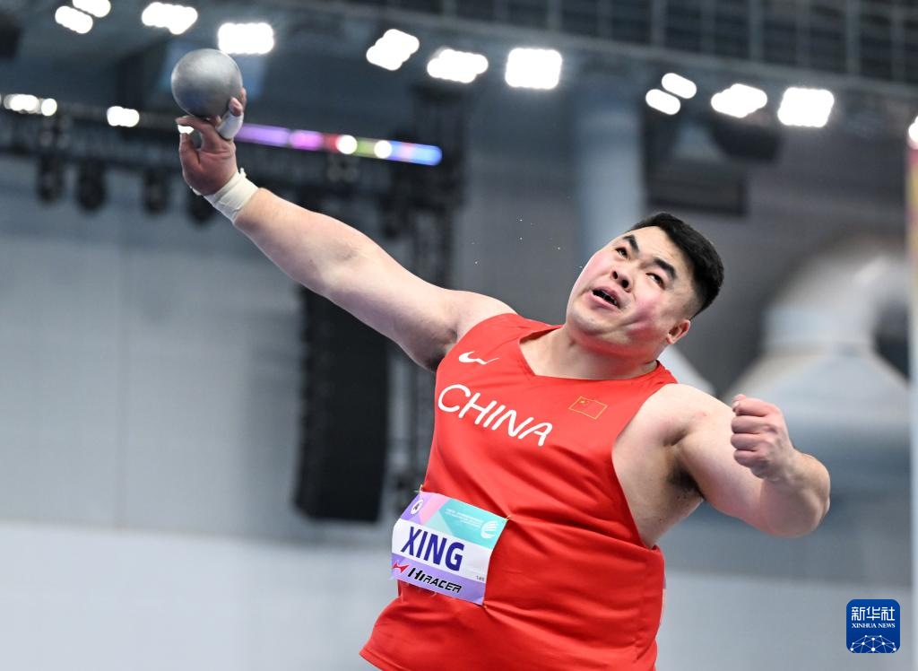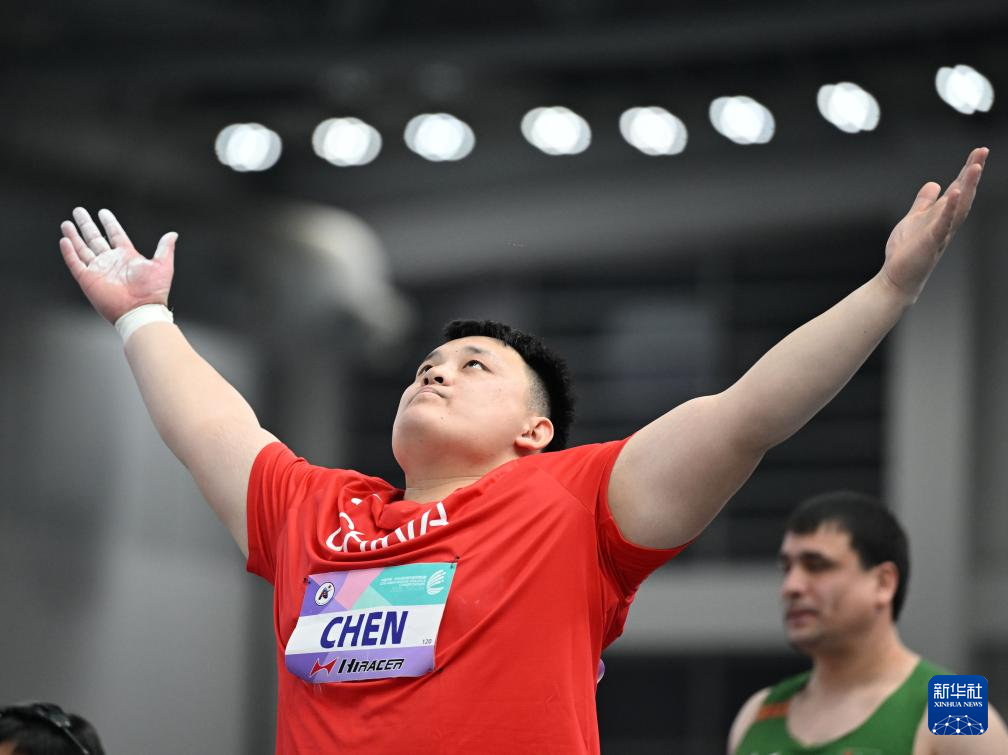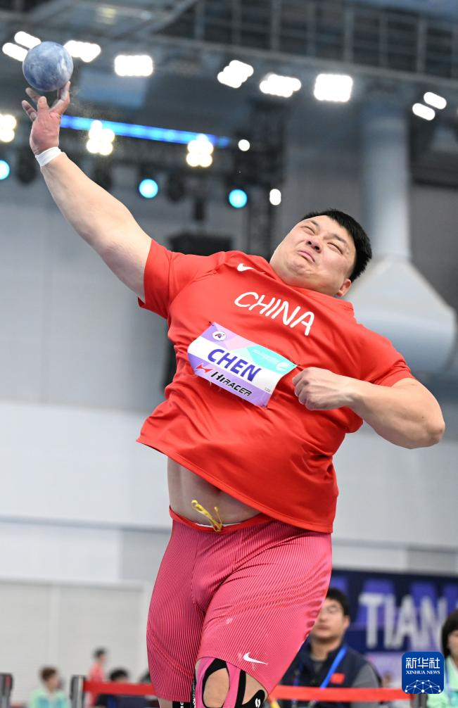 2月8日,中国选手陈成雨在比赛中,他在男子铅球决赛中夺得冠军。新华社记者 赵子硕 摄