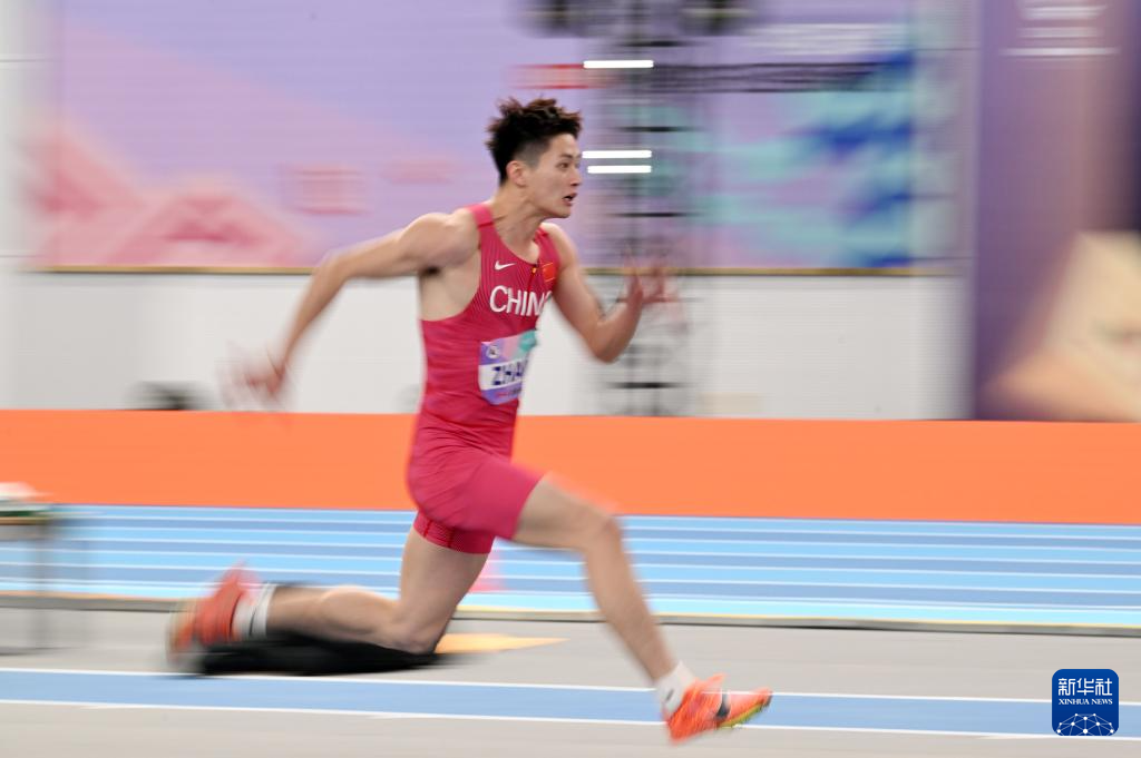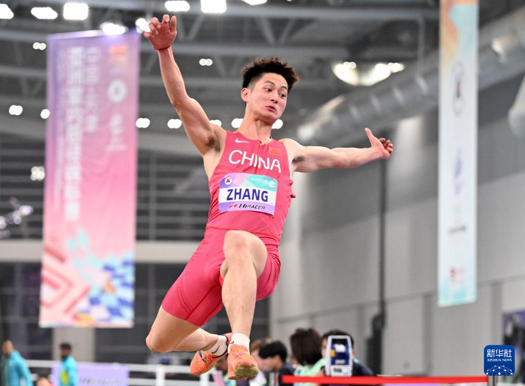 2月8日,中国选手张溟鲲在比赛中,他获得男子跳远决赛冠军。新华社记者 赵子硕 摄pagebreak