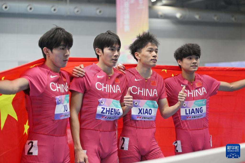 2月8日,中国选手郑驰宇(左一)在男子4x400米接力决赛中,最终中国队获得亚军。新华社记者 李然 摄pagebreak