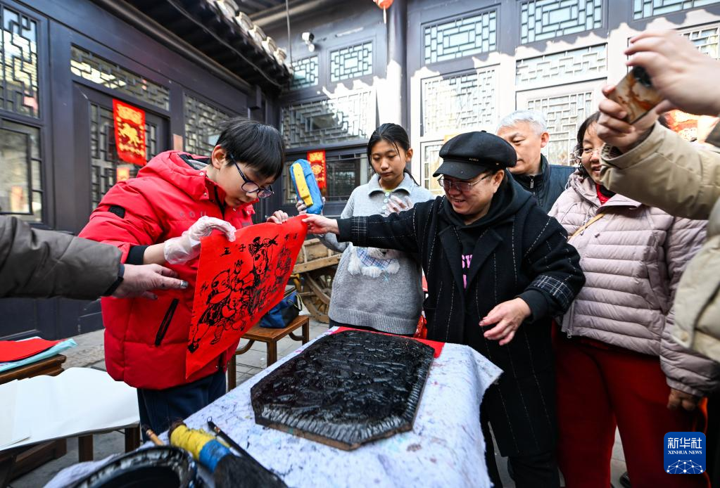 2月22日,游客在杨柳青古镇体验年画制作。新华社记者 赵子硕 摄pagebreak