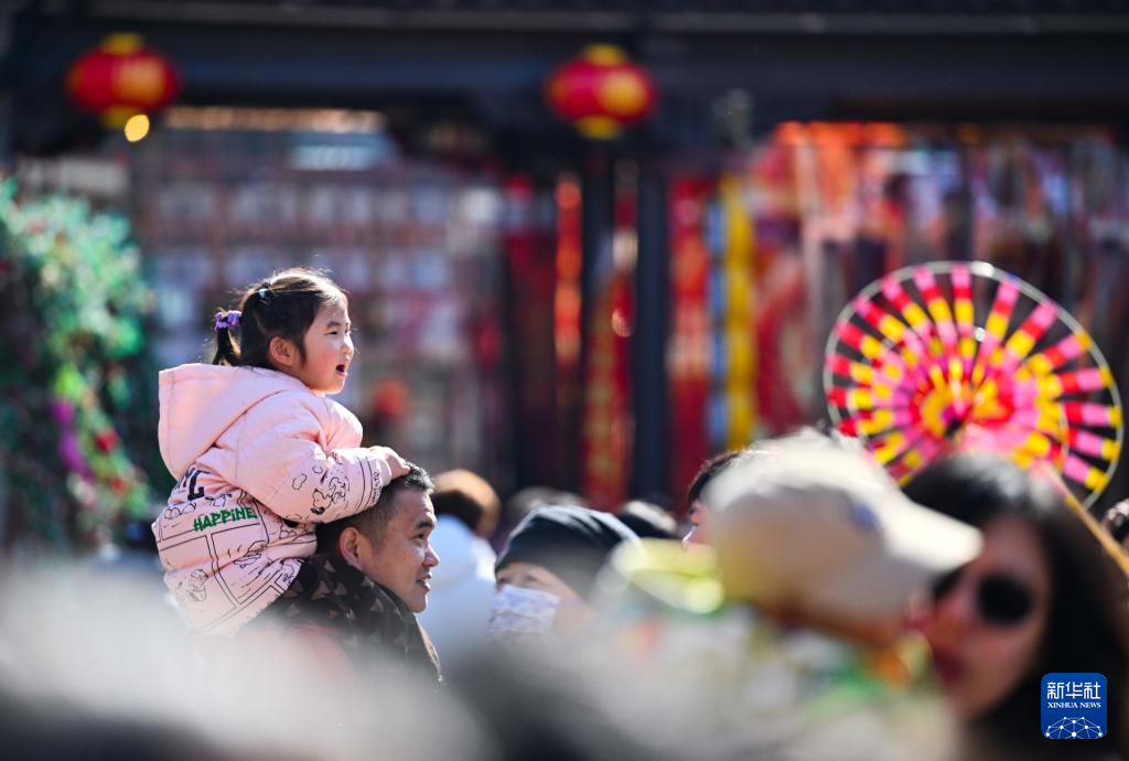 2月22日,游客在杨柳青古镇观看杂技表演。新华社记者 赵子硕 摄