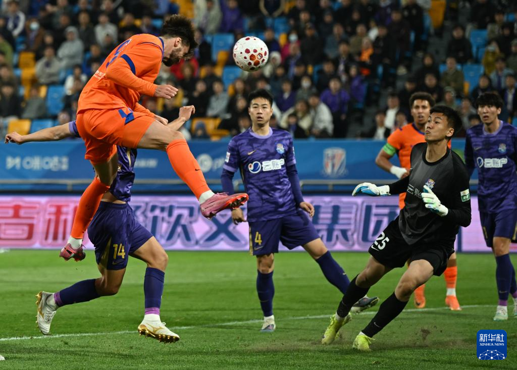 4月21日,山东泰山队球员泽卡(左前)在比赛中头球破门。新华社记者 孙凡越 摄pagebreak