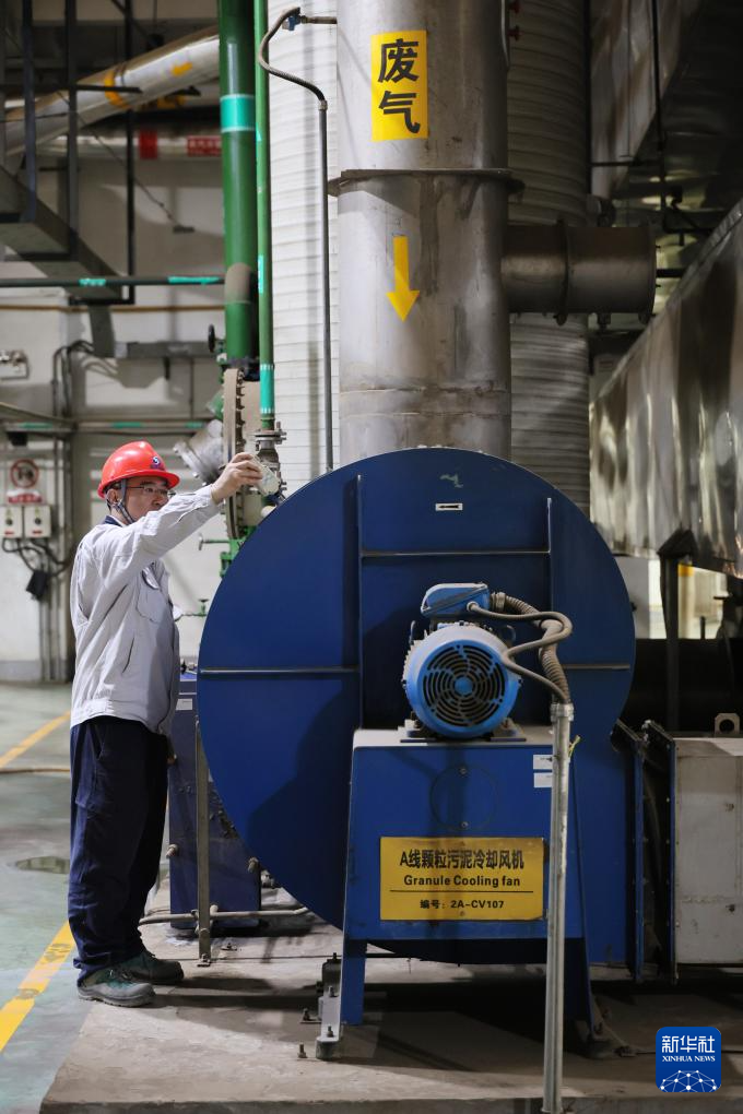 4月23日,工作人员在天津滨海新区循环经济产业园市政污泥干化处理厂检查设备运转情况。新华社记者 李然 摄pagebreak